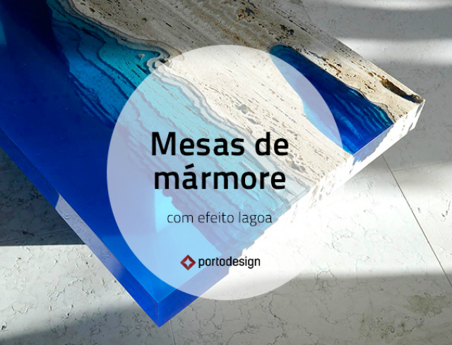 O designer Alexandre Chapelin da empresa La Table criou modelos de mesas que utilizam mármore travertino esculpido com preenchimento de resina azul.