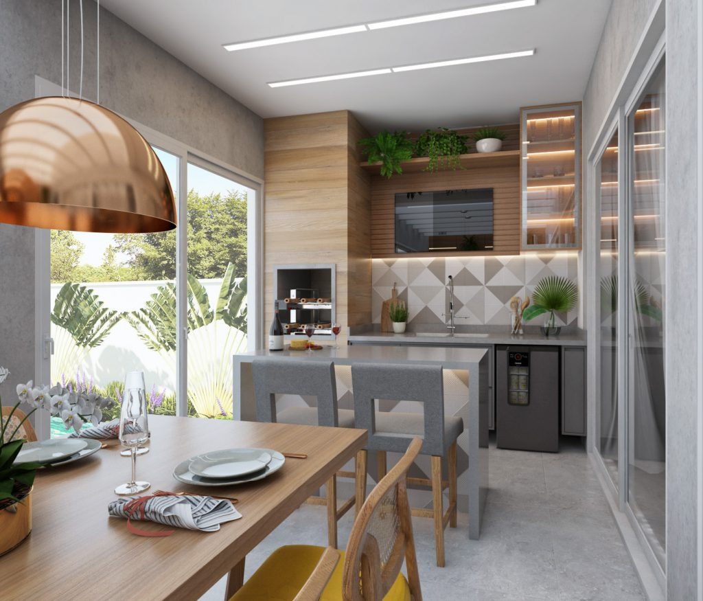 O projeto da designer de interiores Paula Contin também merece atenção. O espaço conta com uma bancada em forma de ilha com prancha de madeira para as refeições. Na decoração, o porcelanato Connect, da Portinari, é o grande protagonista. Desenvolvido em forma triangular, o produto possui diferentes cores e pode ser usado em combinações. Aqui, a opção foi por tons mais neutros, formando desenhos geométricos.
